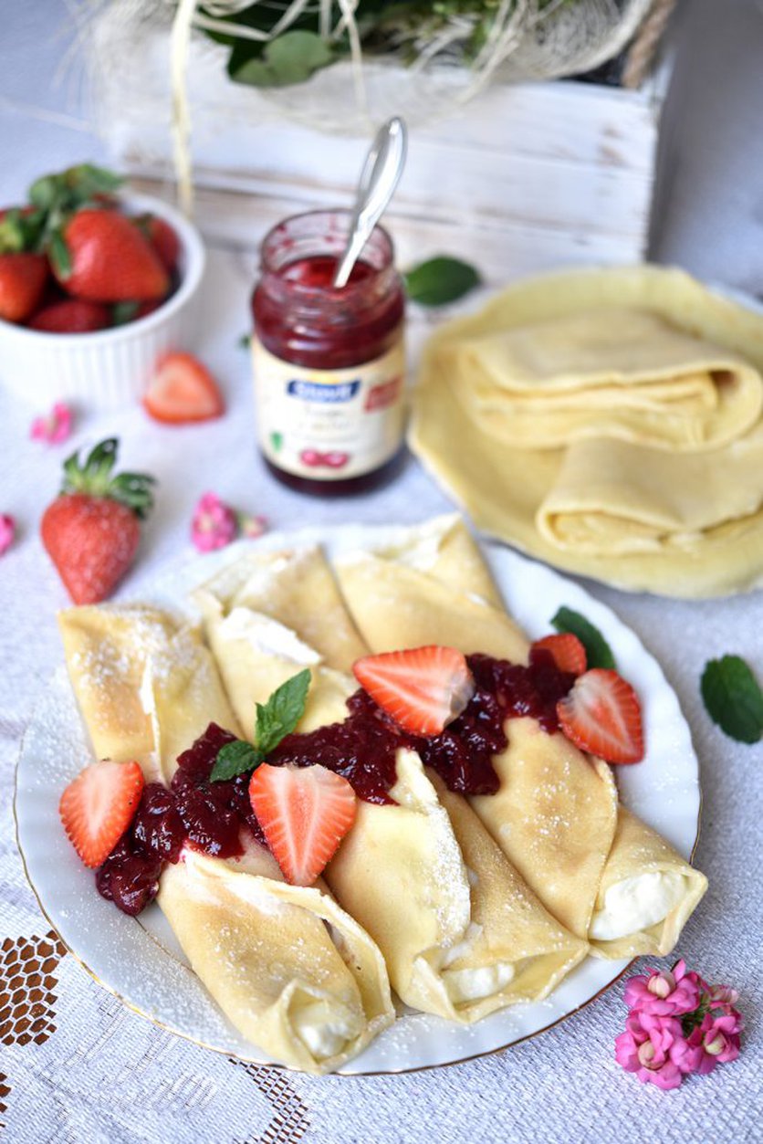 Budyniowe naleśniki z serem i dżemem wiśniowym