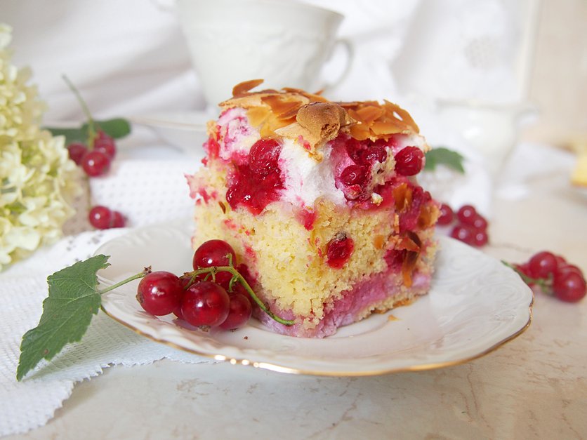 Ucierane ciasto z czerwonymi porzeczkami i bezą