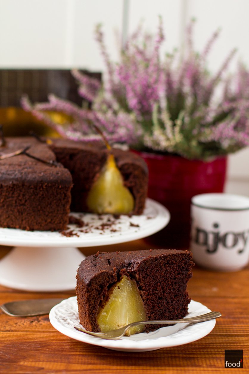 Bezglutenowe ciasto czekoladowe z całymi gruszkami gotowanymi w syropie