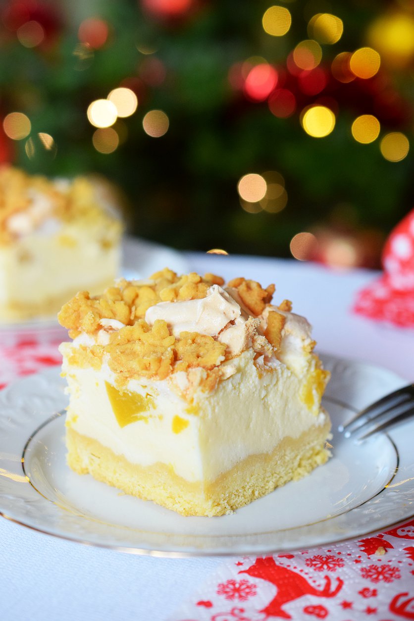 sernik z brzoskwiniami i delikatną bezą