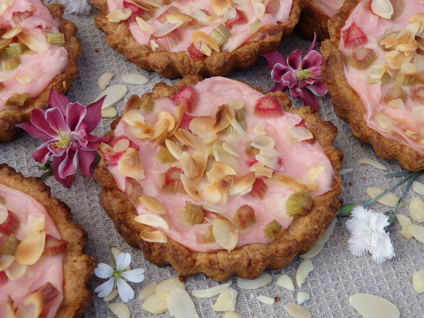 Orkiszowe mini tarty z budyniem i rabarbarem