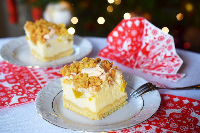 Sernik z brzoskwiniami i delikatną bezą