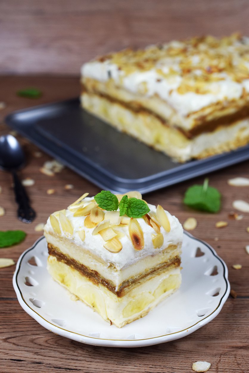 Tort naleśnikowy z kremem z masła orzechowego i karmelizowanymi bananami