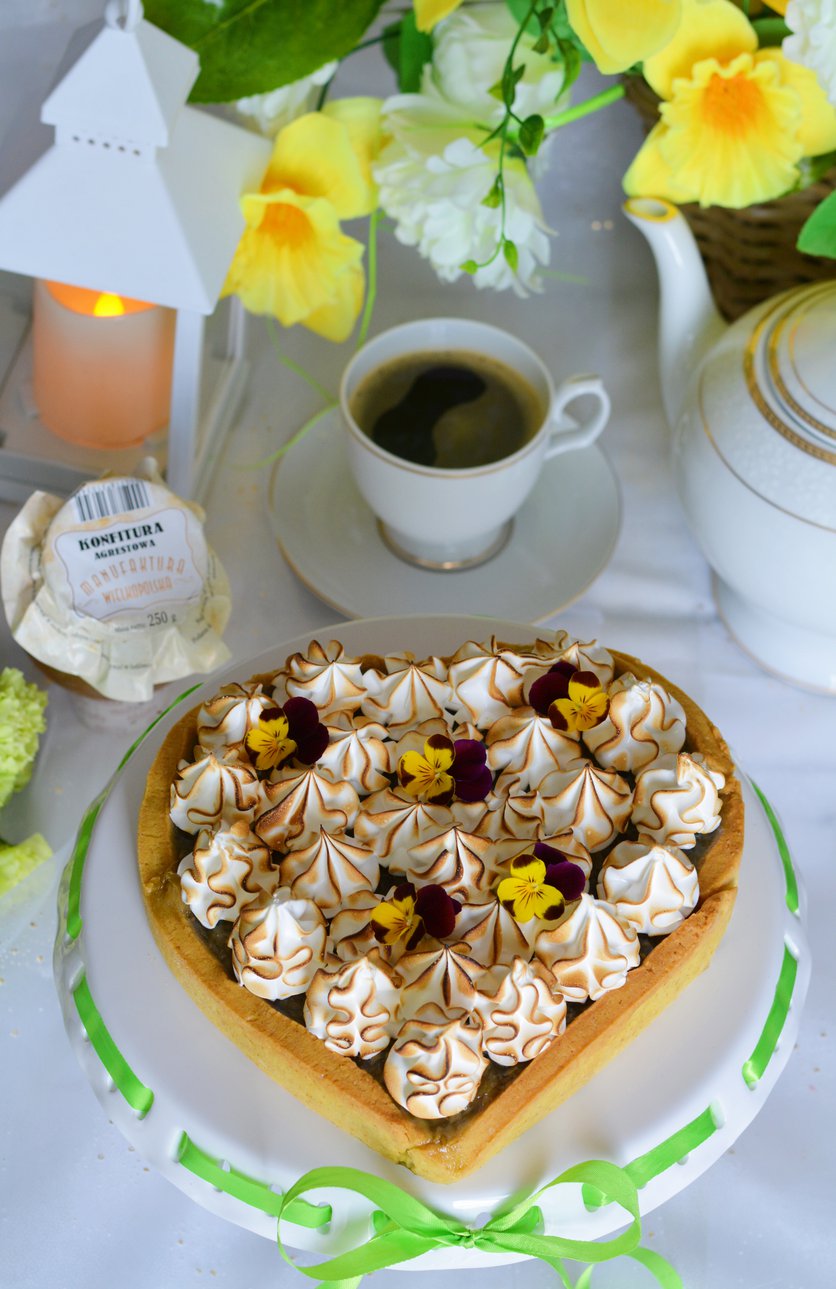Kruche serce z orzeźwiającym musem agrestowym i bezowymi rozetkami