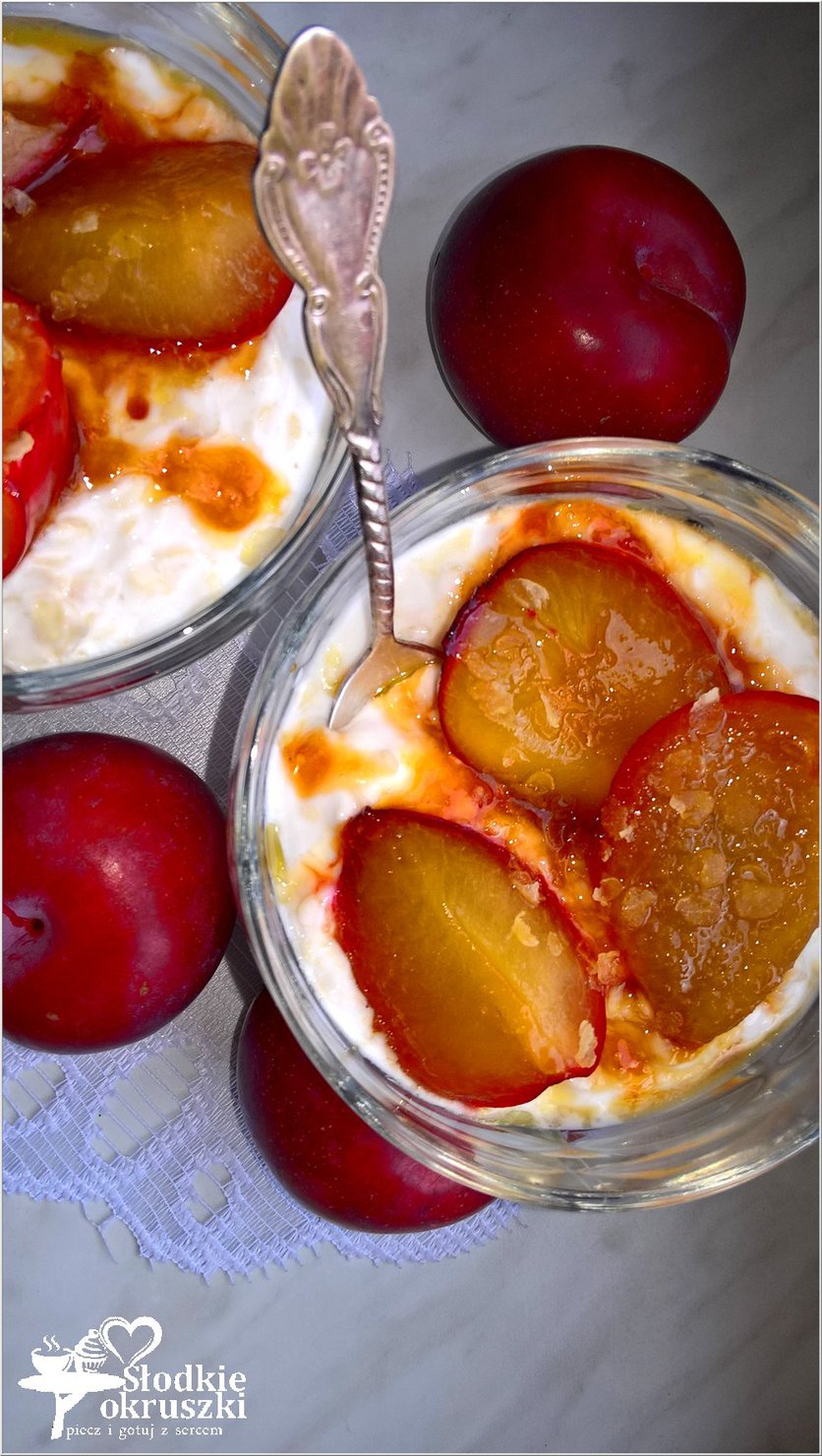 Karmelizowane śliwki na płatkach jaglanych w jogurcie.