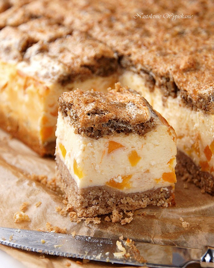 Sernik z brzoskwiniami i orzechową bezą