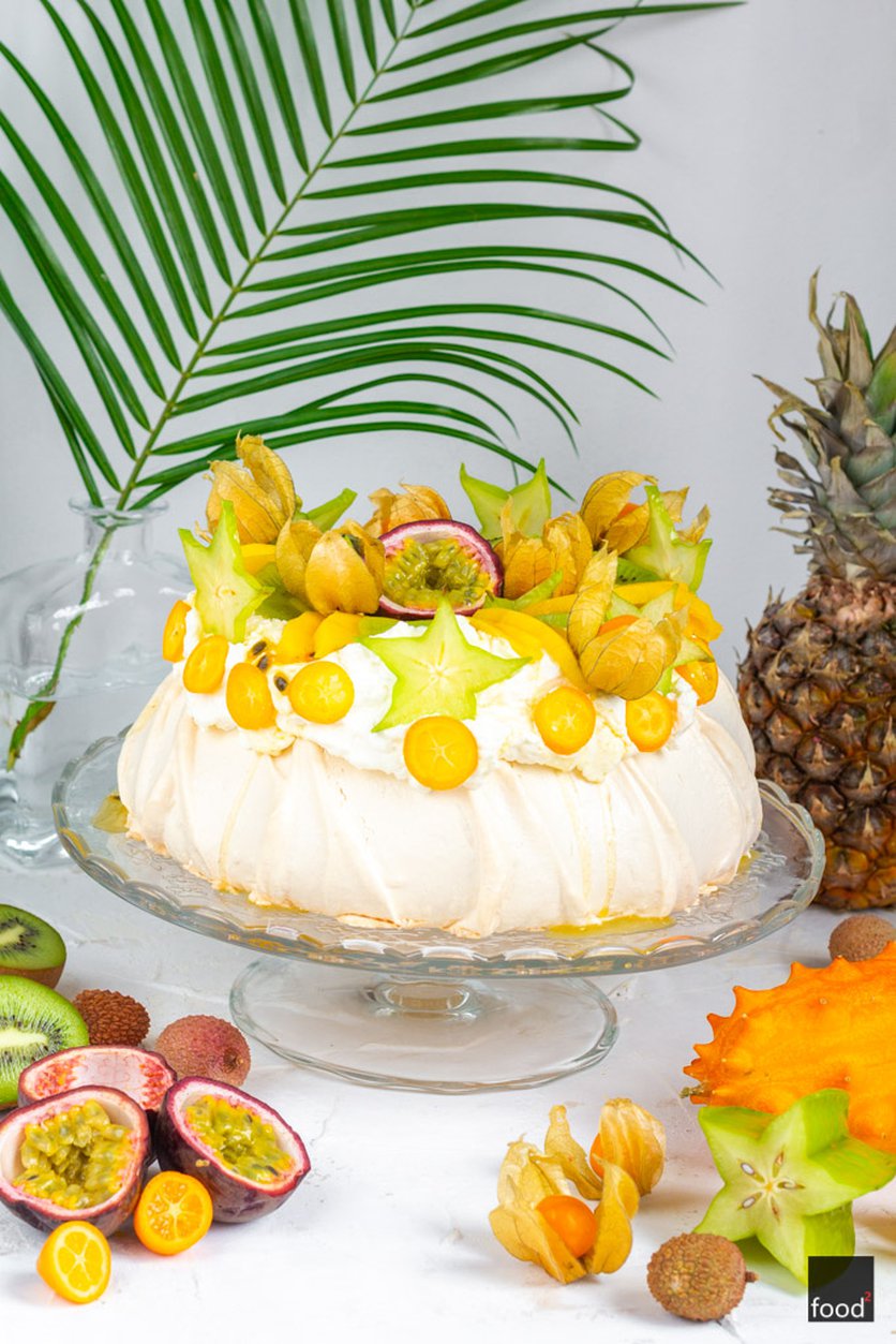 Tropikalna pavlova z egzotycznymi owocami i kremem kokosowym