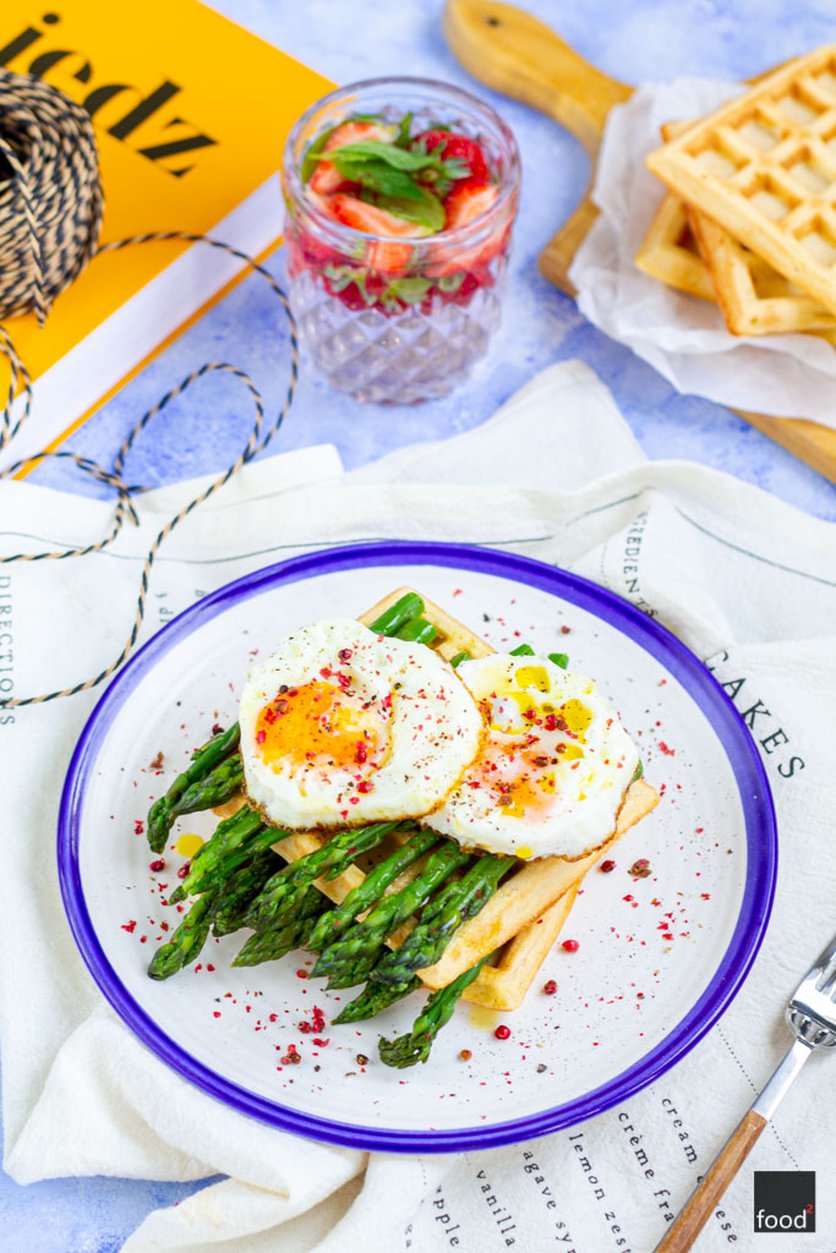 Gofry z mąki kokosowej ze szparagami i jajkiem sadzonym
