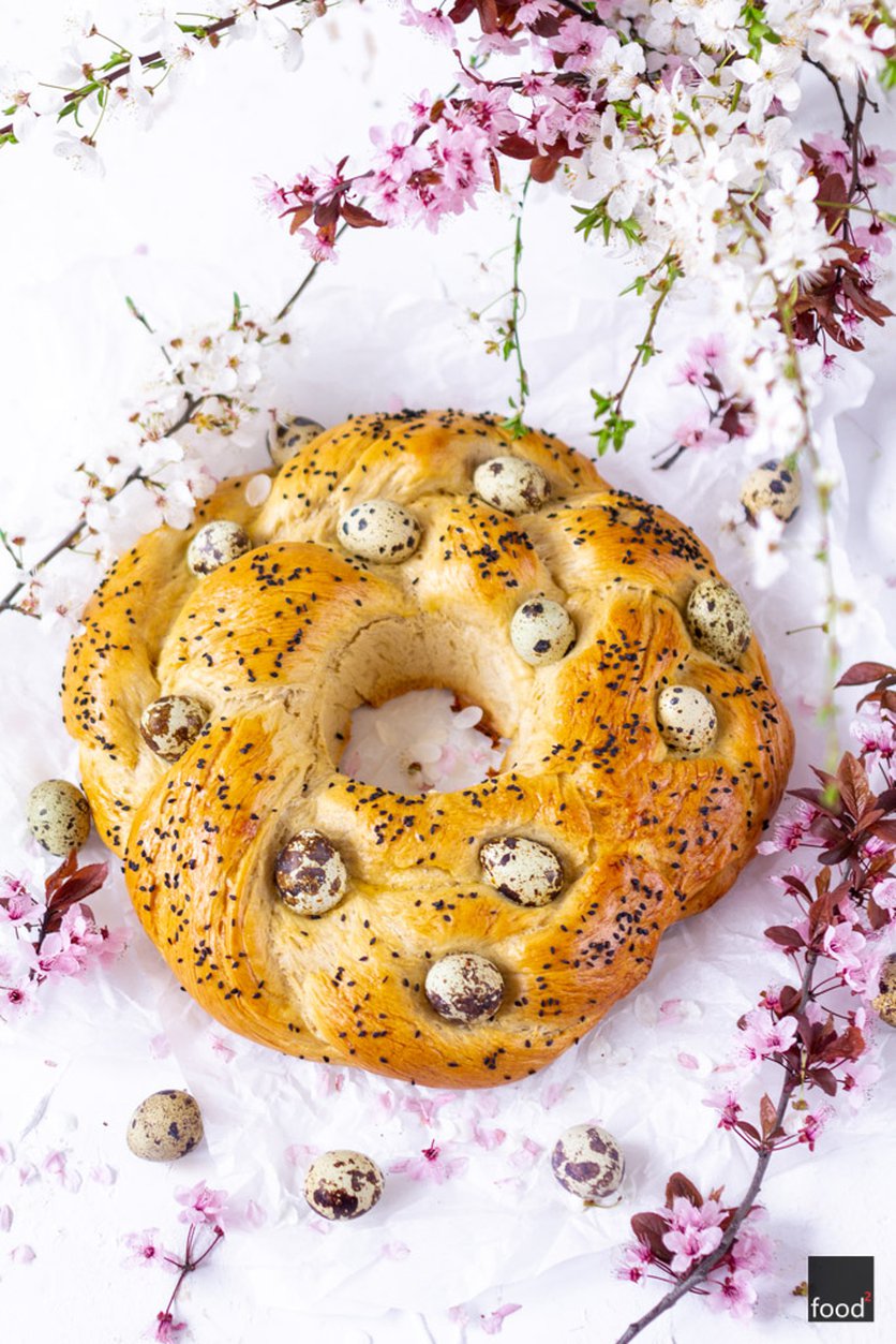 Tsoureki - wielkanocny wieniec drożdżowy z jajkami przepiórczymi