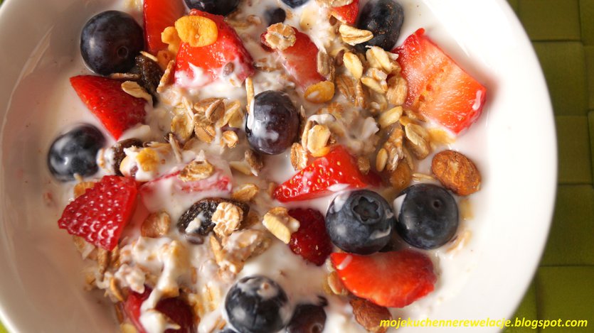 Jogurt naturalny z malinami, borówką amerykańską i domową granolą