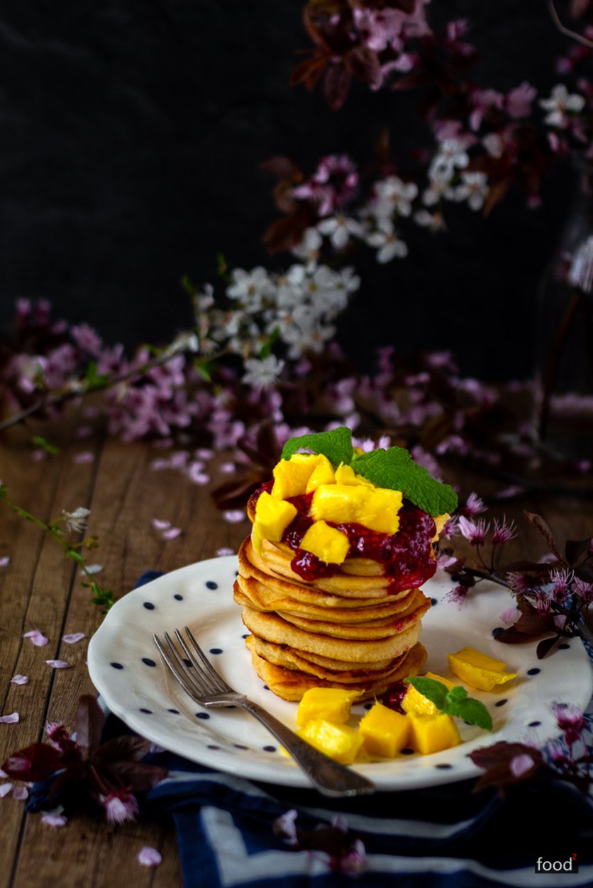 Kokosowe pancakes z musem malinowym i mango