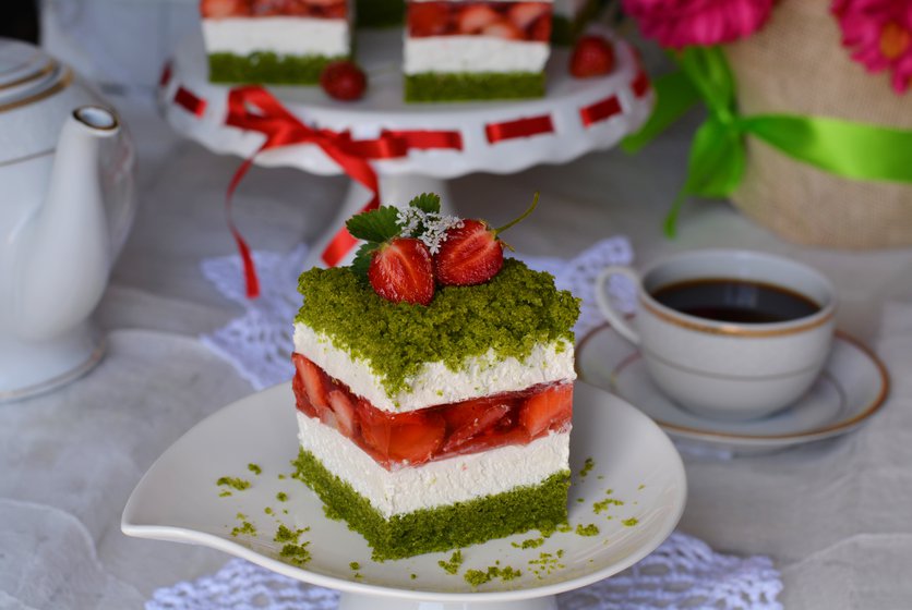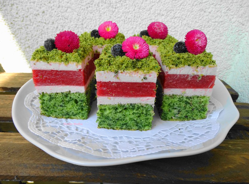 Ciasto szpinakowe z musem rabarbarowym i kremem truskawkowym.