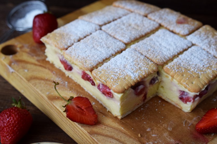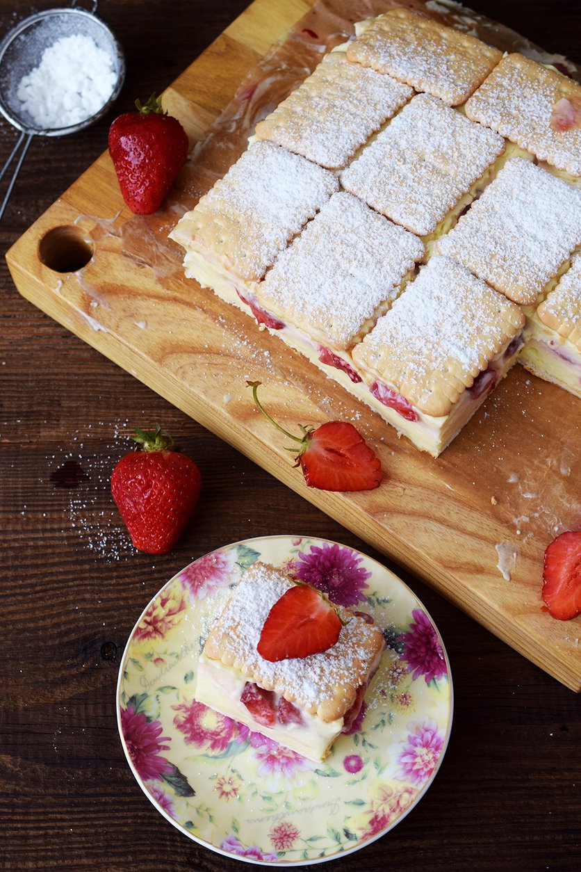 Kremówka na herbatnikach z truskawkami (bez pieczenia)