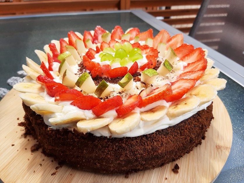 Wilgotne ciasto czekoladowe z bitą śmietaną i owocami