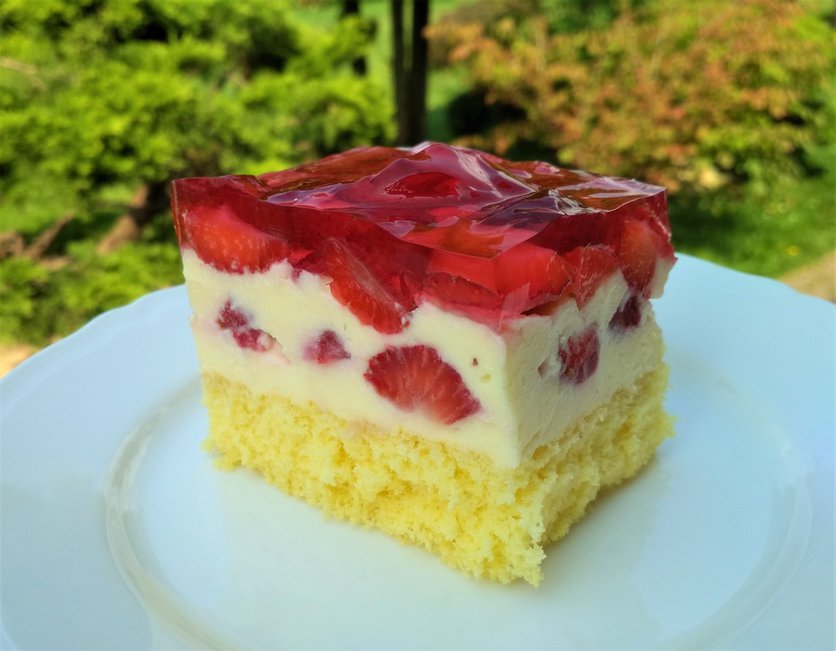 Ciasto budyniowe z truskawkami i galaretką