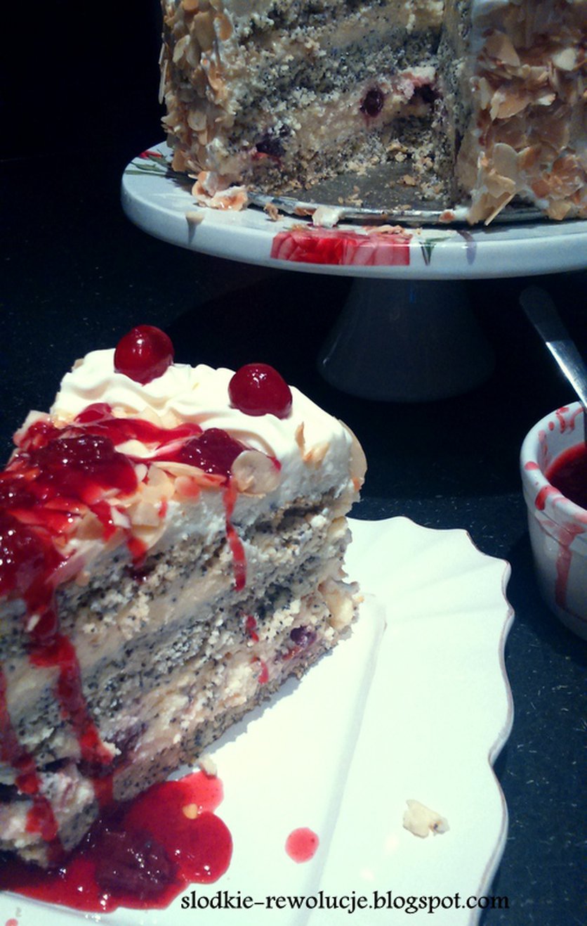 Sernik makowo-migdałowy z sosem wiśniowym
