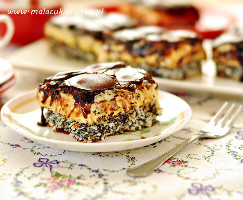 Ciasto makowe z kokosem i kremem, polane czekoladową polewą