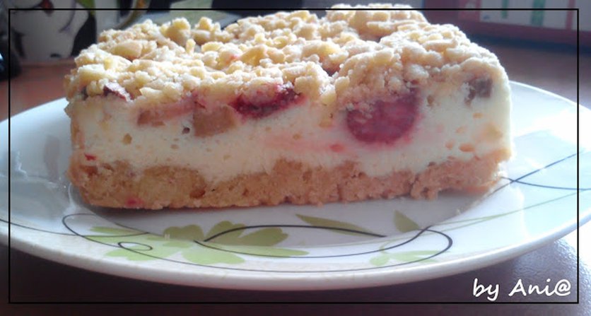 Kruche ciasto truskawkowo-rabarbarowe z budyniową pianką