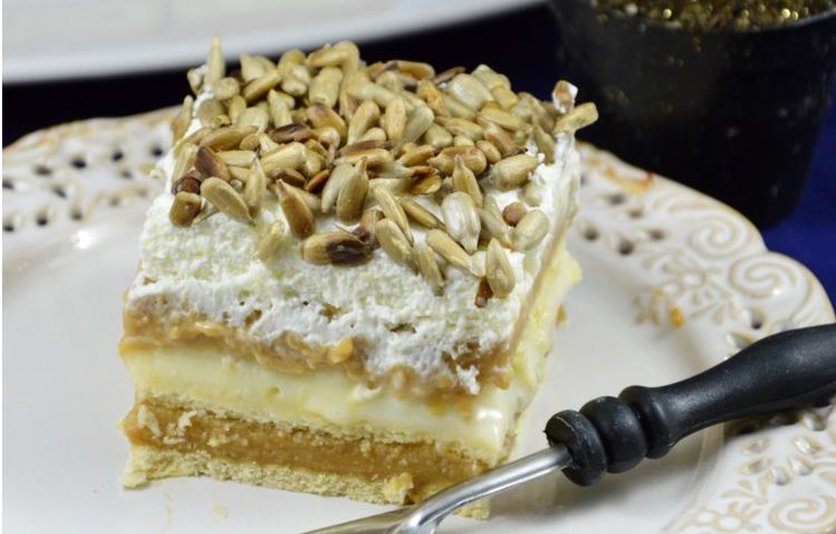 Rewelacyjne ciasto bez pieczenia z masą krówkową i prażonym słonecznikiem