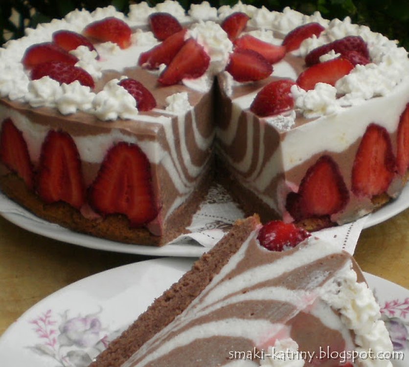 Jogurtowiec zebra z truskawkami, ciasto jogurtowe, lekkie, dwukolorowe, pyszne