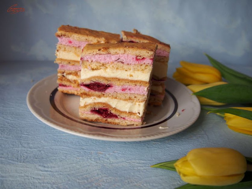 Biszkopt kakaowy z masą budyniową i frużeliną wiśniową