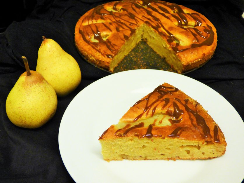 Marcepanowe ciasto z gruszkami i polewą czekoladową