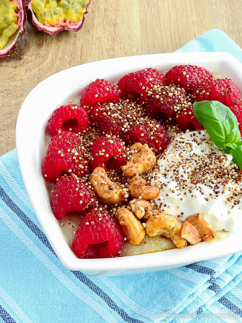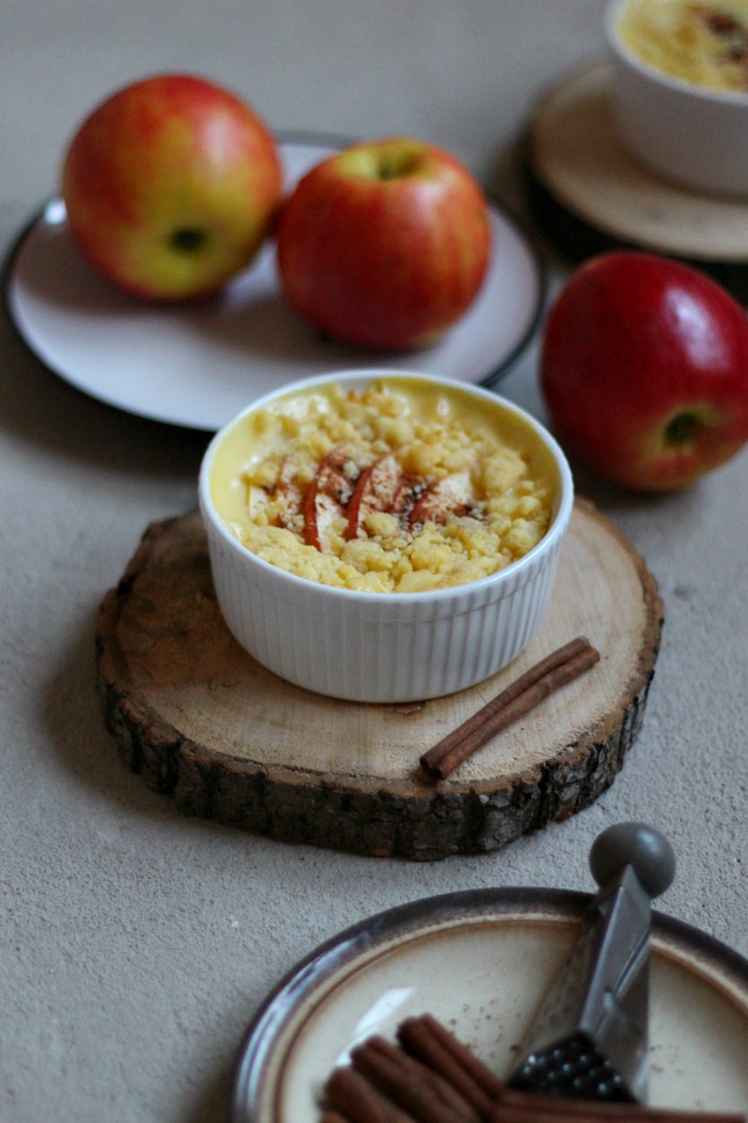 Pudding zapiekany pod kruszonka z dodatkiem jabłek i cynamonu.