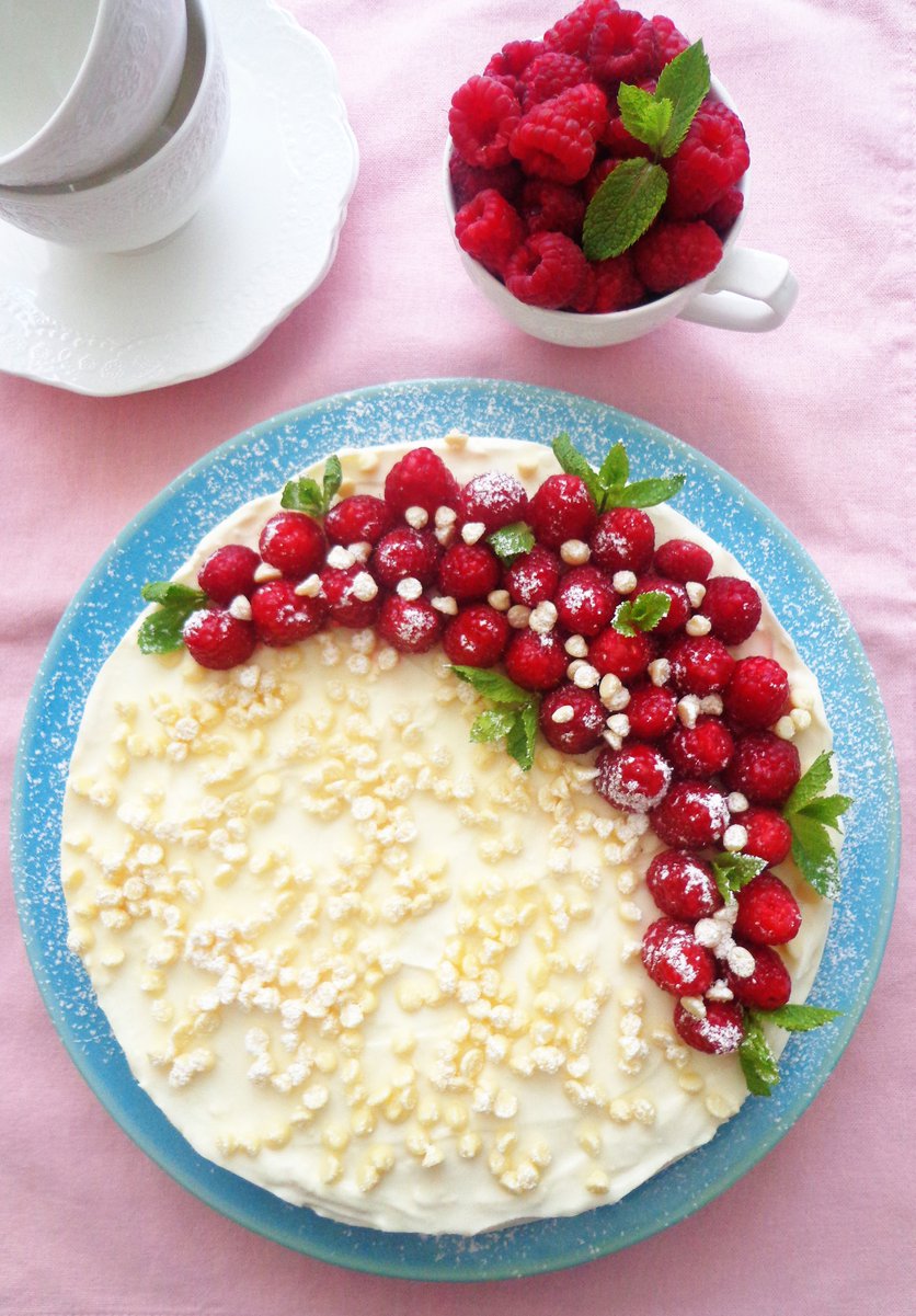 Kakaowa tarta z kremem z białej czekolady z malinami