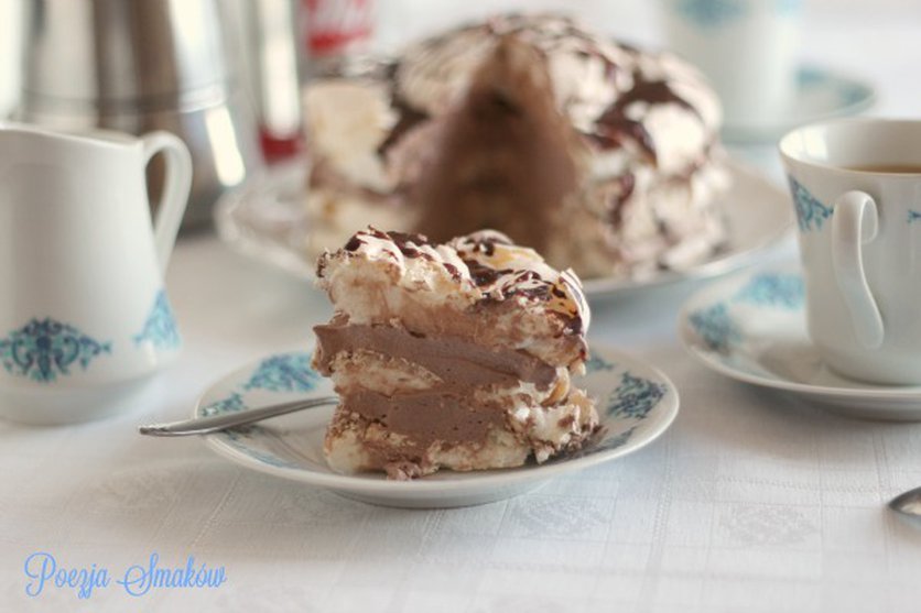 Kremowy torcik bezowy z ganache czekoladowym - ciasto idealne do kawy.
