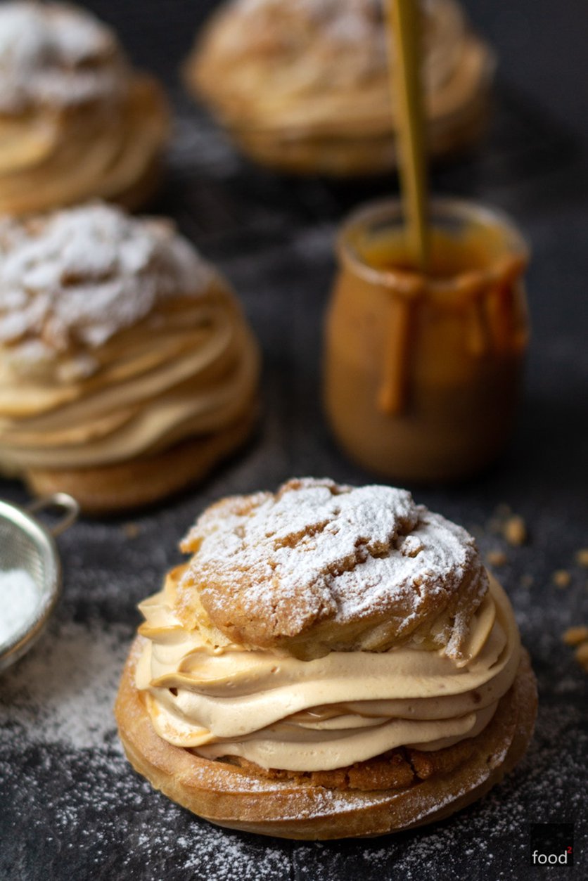 Ptysie z prażonym jabłkiem, kremem karmelowym i kruszonką z masłem orzechowym