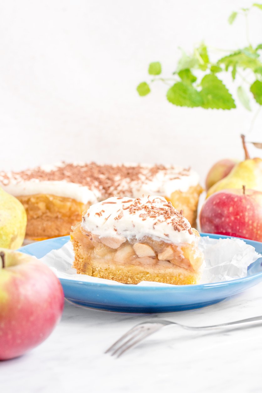 Obłędne ciasto jabłkowo-gruszkowe z owocowym budyniem i kremem