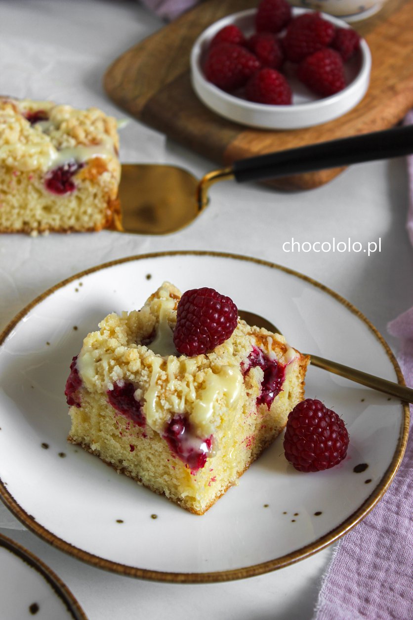 Ciasto z białą czekoladą, malinami i kruszonką
