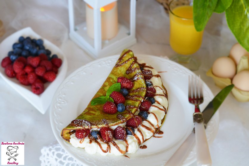 Szpinakowy omlet z owocami, masą śmietanową i czekoladową nutą