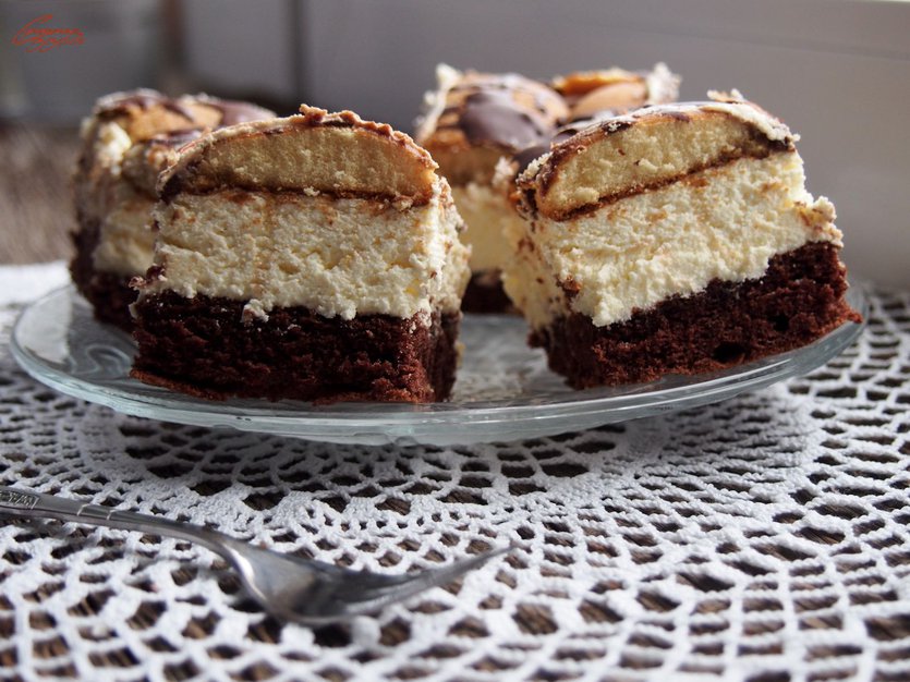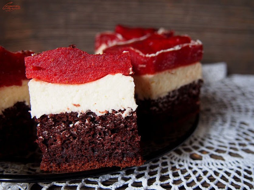 Ciasto czekoladowe kremem budyniowym i musem truskakowym