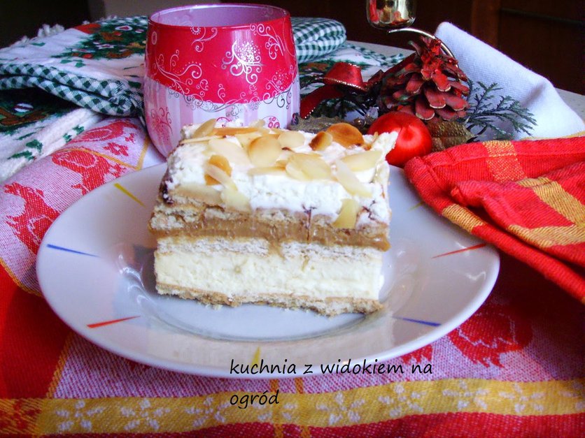 Ciasto na zimno na herbatnikach z masą krówkową i bitą śmietaną.