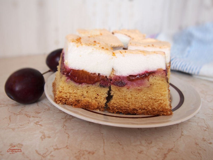 Ucierane ciasto ze śliwkami i bezą