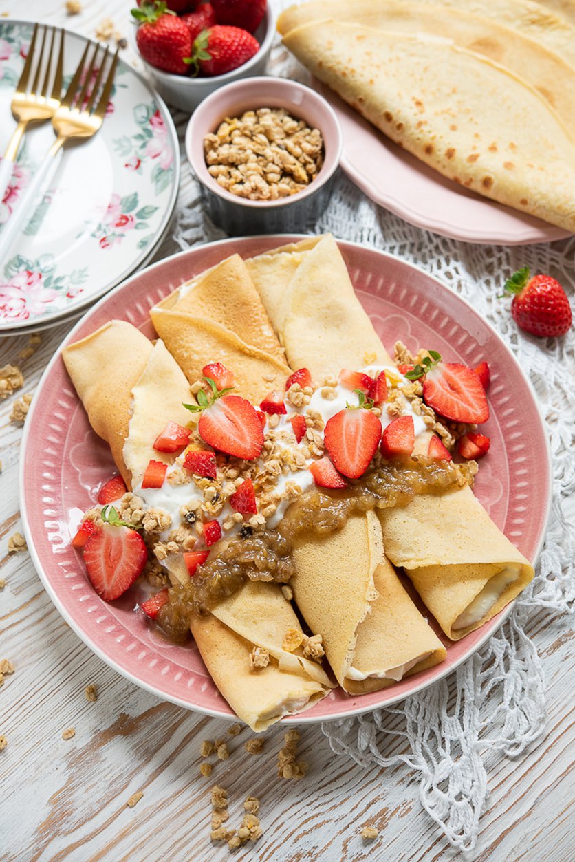Tort naleśnikowy przekładamy serowym oraz rabarbarowo-truskawkowym nadzieniem