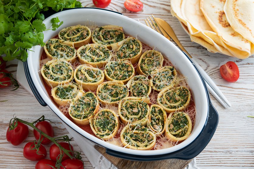 Zapiekane naleśniki ze szpinakiem i wieprzowiną
