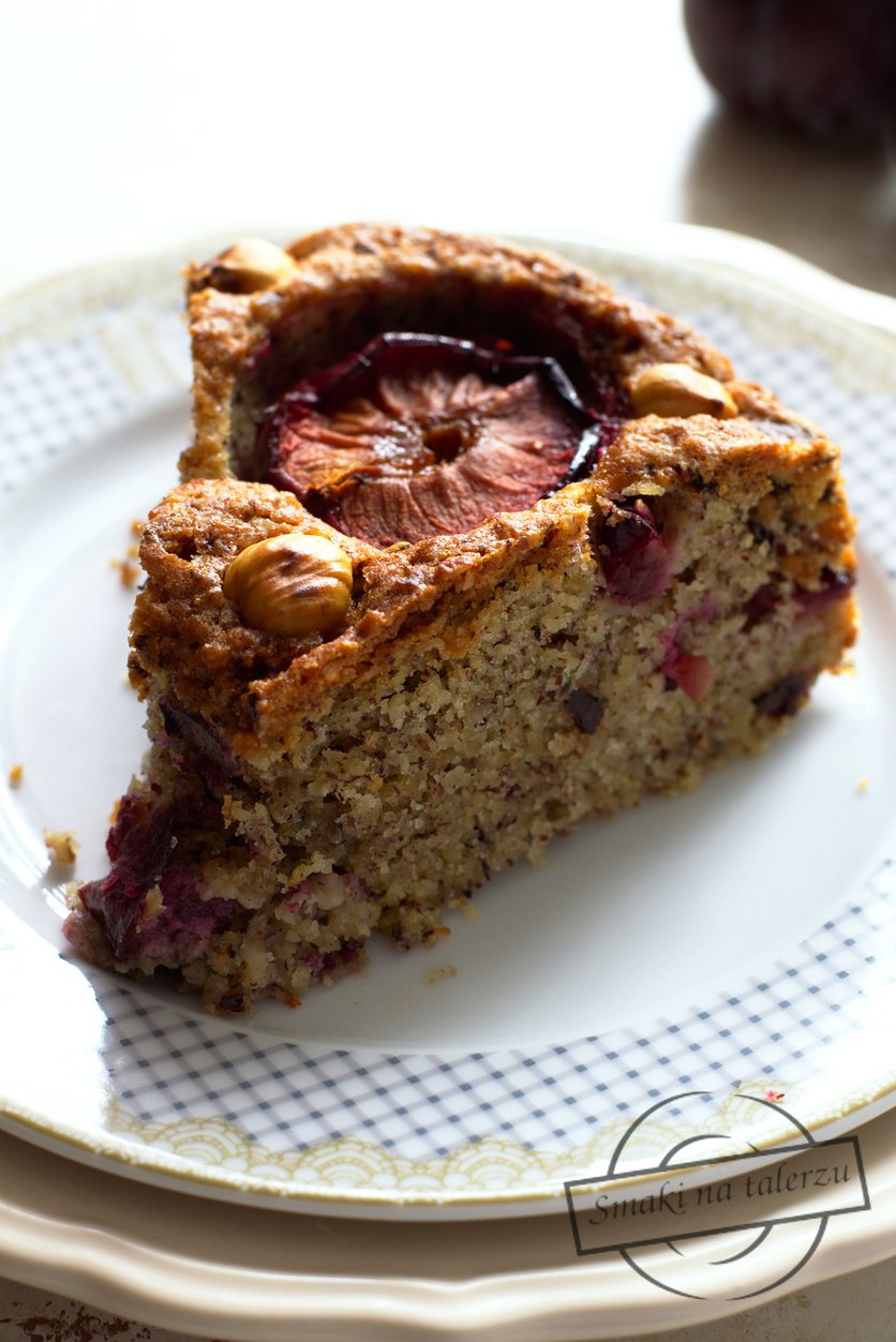 Ciasto z orzechami laskowymi, śliwkami i czekoladą