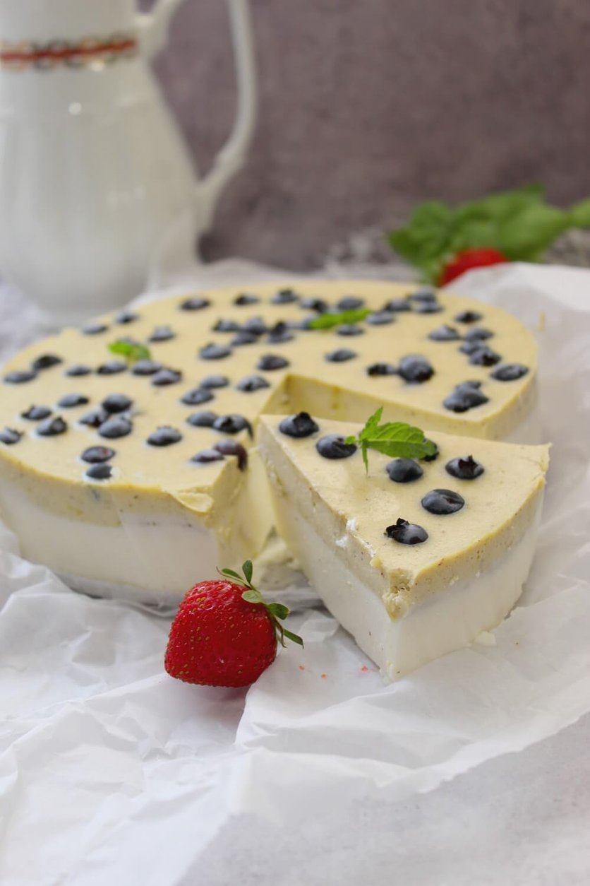 Sernik mascarpone z pistacjową warstwą i borówkami