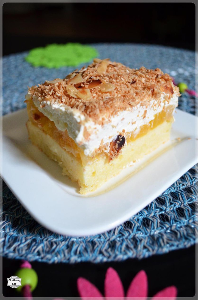 Ciasto z brzoskwiniami, bitą śmietaną i prażonym kokosem