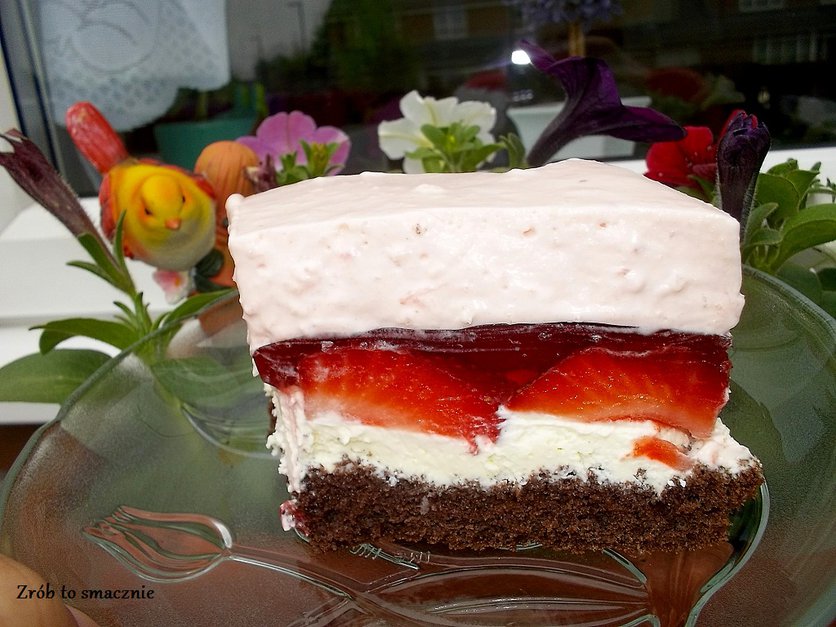 Biszkopt z kremem budyniowym, truskawkami i galaretką