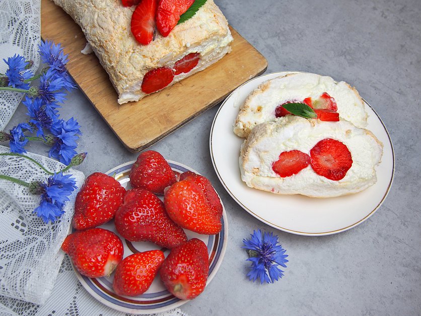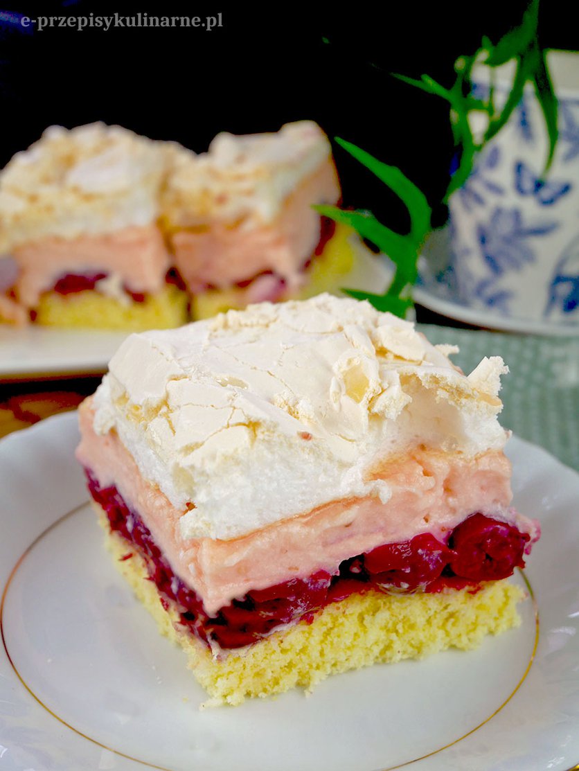 Ciasto Różowa Landrynka – prosty biszkopt z owocami, kremem i bezą
