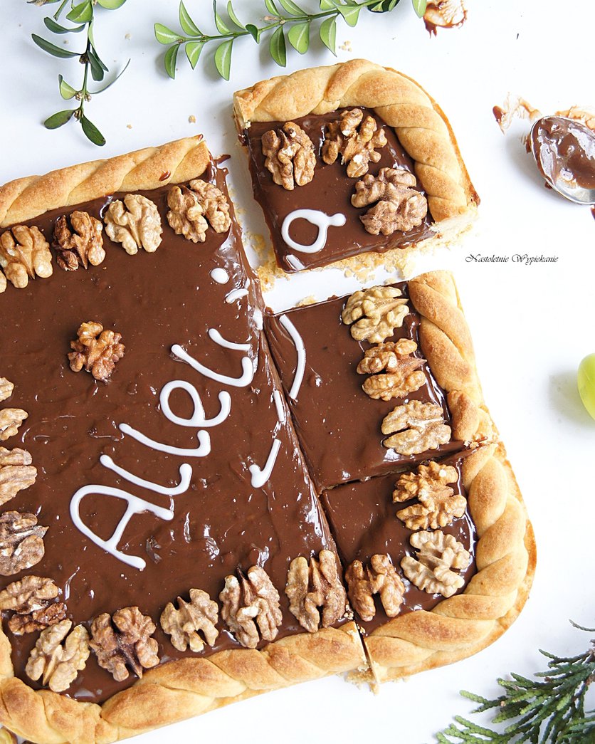 Mazurek orzechowy z kremem jabłkowym i polewą z białej czekolady