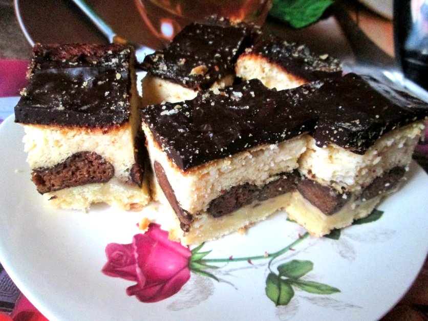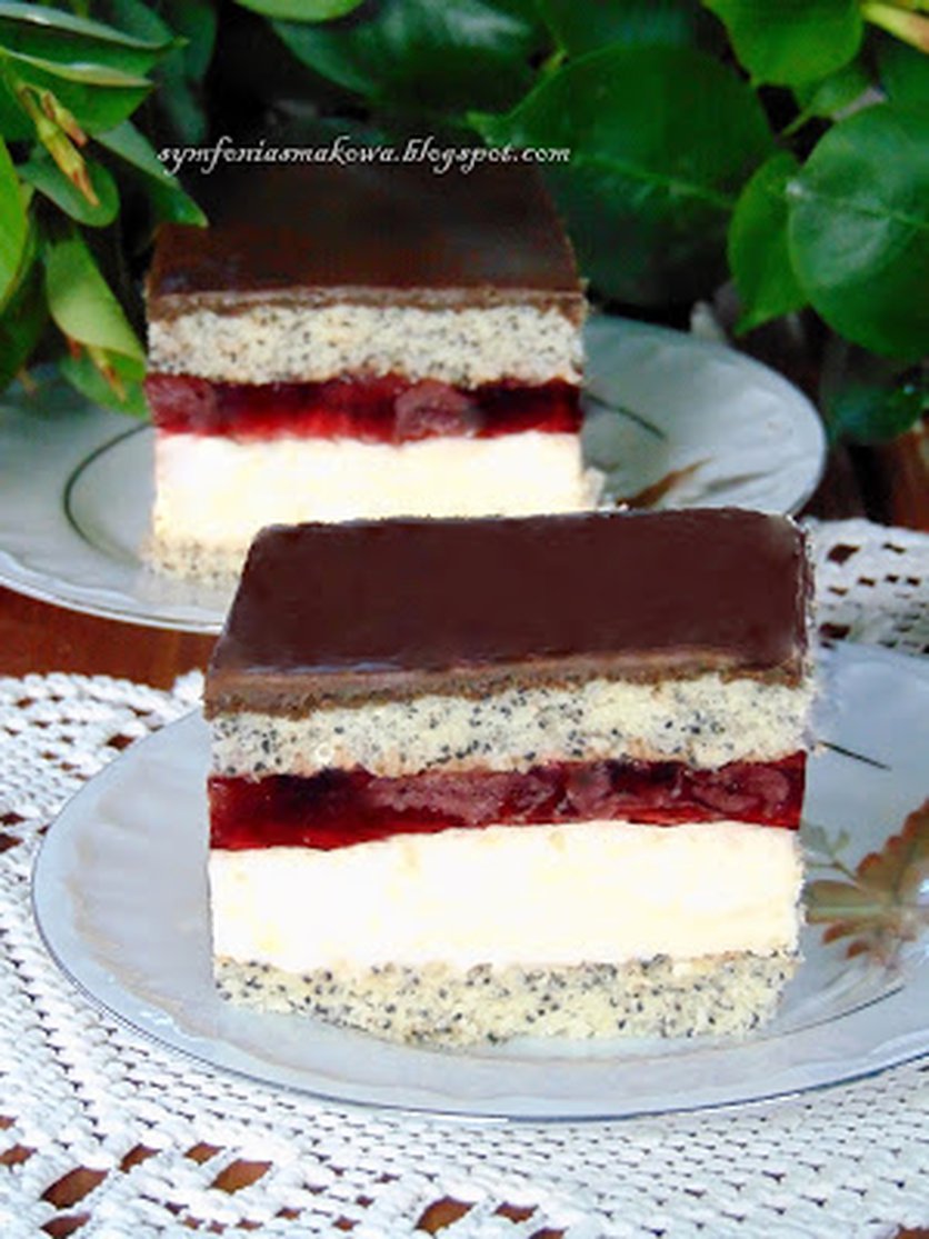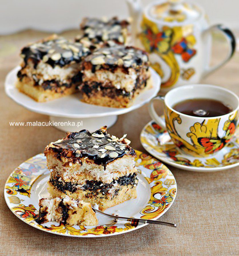 Ciasto makowe z kokosem i kremem, polane czekoladową polewą