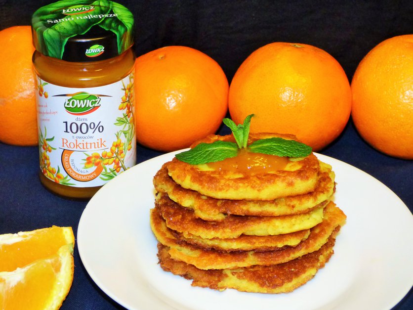 Bezglutenowe placuszki jaglane z nutą pomarańczy i dżemem z rokitnika