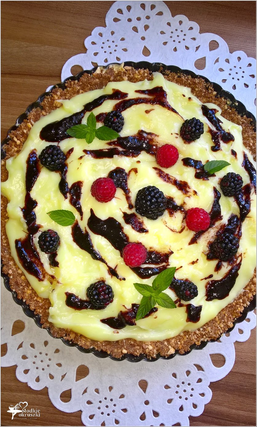 Budyniowa tarta bez pieczenia z konfiturą z czarnego bzu i owocami