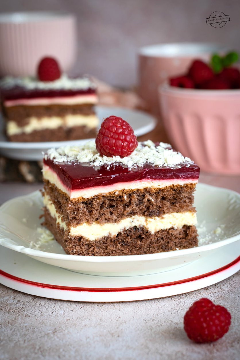 Kakaowy biszkopt z masą ajerkoniakową i malinami