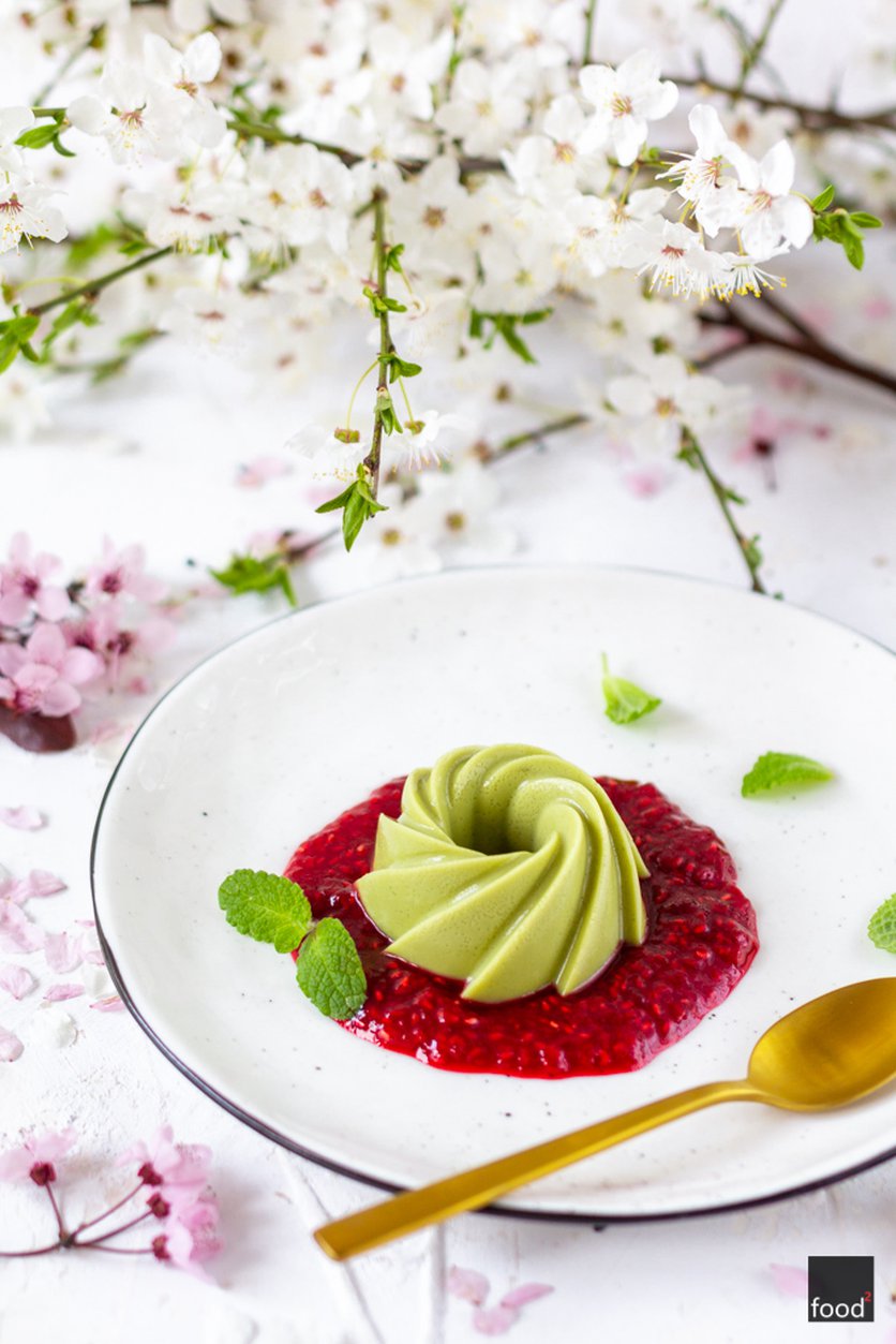 Kokosowa panna cotta z zieloną herbatą matcha i sosem malinowym