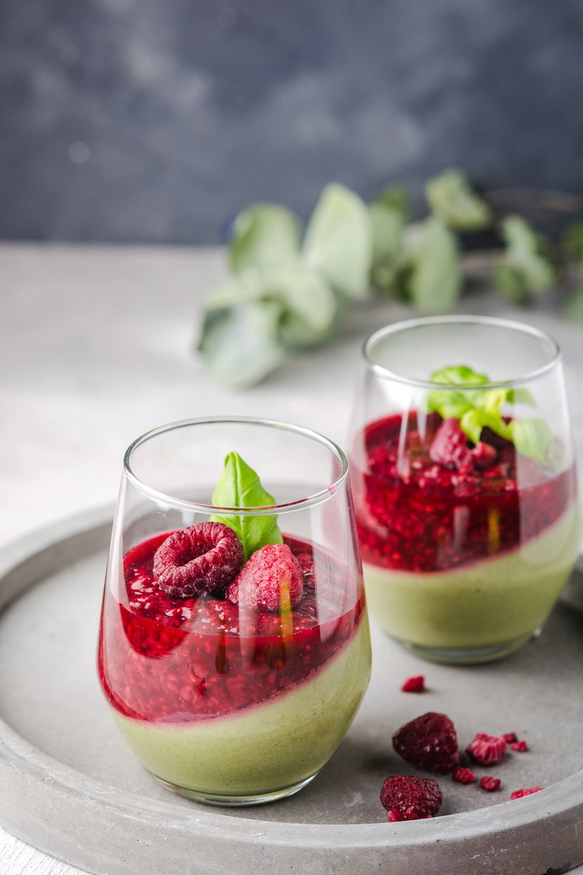 Jogurtowa panna cotta z matchą i malinami